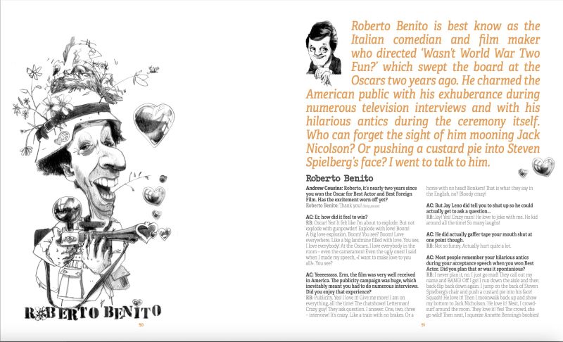 25 years ago, Andrew Lowes wrote a series of satirical interviews with familiar but imagined cinema celebrities for the online indie film magazine Netribution. These were brought to life a few years later by French cartoonist Éric Dubois, with a brilliant set of illustrations, many of which have never been seen.